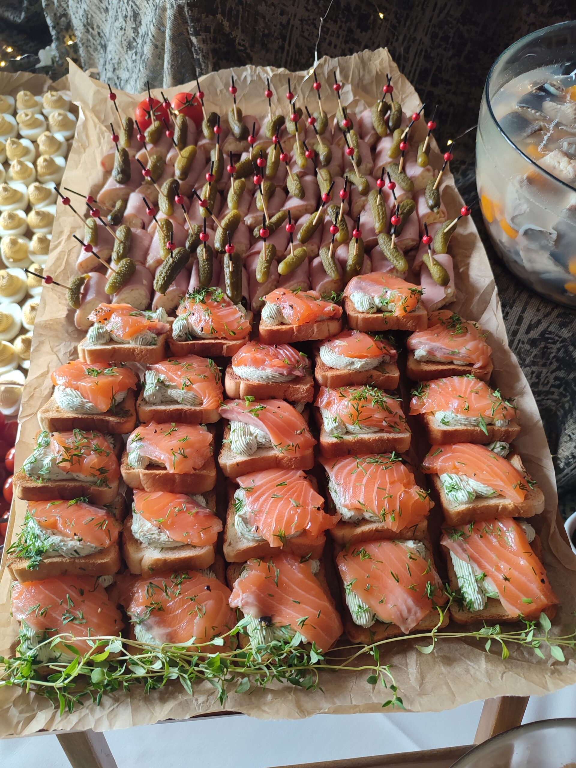 Lõhe sashimi, täidetud munad forellimarjaga, sinepimarinaadis lõhe, lumikrabi tortillarullid, kilutrühvlid rukkileivaga, räimerullid